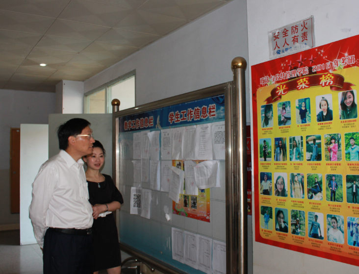 5月15日上午,董事长王成端率教务处、校办、评估处督导专家一行来学院检查指导中期教学工作。王董事长在公司党政领导的陪同下,查看了学院宣传展板、走访了办公场所、图书资料室、教研室,详细了解了学院的办公条件。