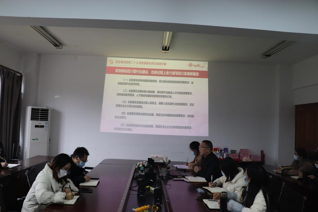 刘春辉书记以《坚定推动党的二十大决策部署在四川落地生根》为题,从四个方面阐述了党的二十大的主要内容以及如何在四川落地生根:一是党的二十大精神的主要内容;二是新发展格局和高质量发展;三是科教兴国、教育人才和创新驱动发展;四是推动新时代四川高质量发展。刘春辉全面介绍了党的二十大十五个理论创新点,并强调学懂弄通做实党的二十大精神,要在全面学习上下功夫。刘书记鼓励学院各位教师将党的二十大报告精神贯穿于教学与课题研究中,不断提升理论水平和讲解能力,真正将党的二十大精神学深悟透、融会贯通。