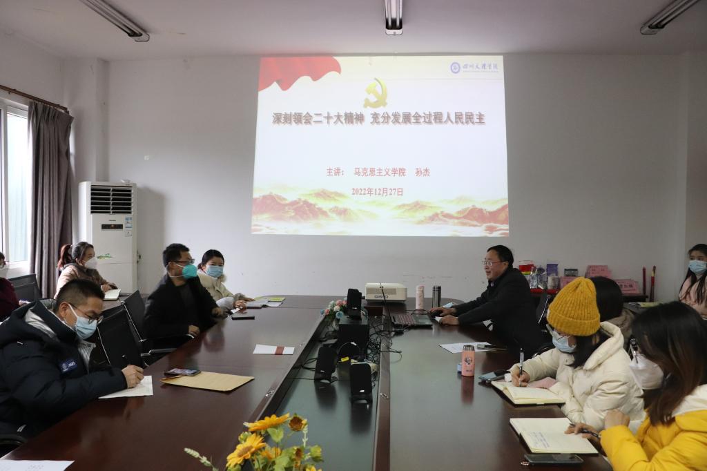 为深入学习贯彻党的二十大精神,2022年12月27日,经理孙杰教授在博文楼611会议室为bevictor伟德官网全体教师做“深刻领会二十大精神 充分发展全过程人民民主”的专题报告。