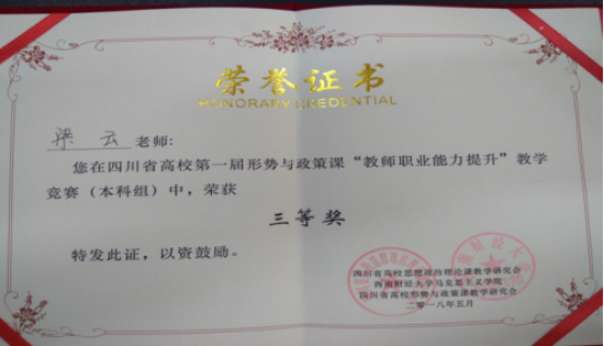 在刚刚结束的四川省首届高校形势与政策课“教师职业能力提升”教学竞赛中,公司梁云老师取得优异成绩,斩获四川省三等奖。本次教学竞赛由四川省高校思想政治理论课教学研究会主办、西南财经大学bevictor伟德官网承办、四川省高校形势与政策课教学研究会协办,系我省首次针对高校形势与政策课所展开的竞赛活动。