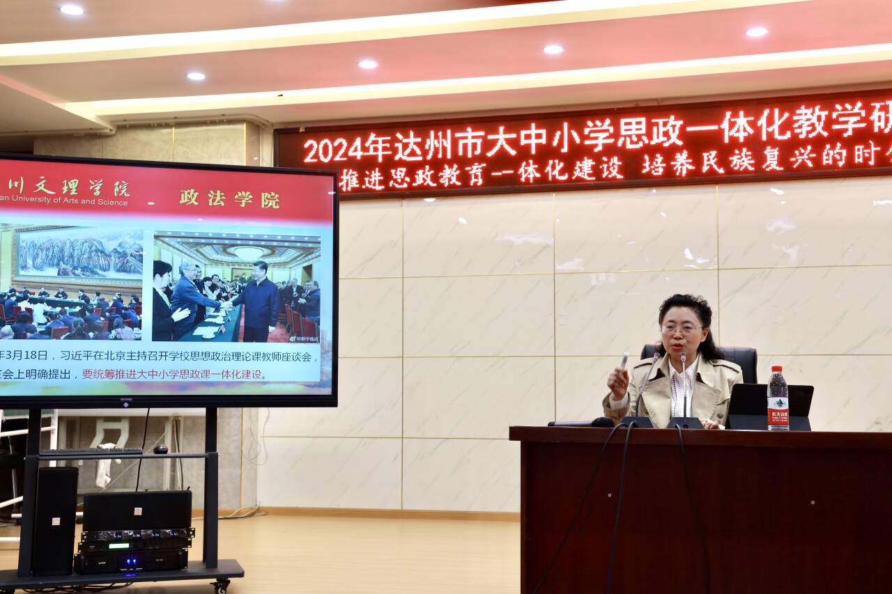 在听取达州市小学、初中及高中学段教师观摩课之后,政法学院曹红梅教授以《“一体化”视域下大中小思政课教学目标和方法漫谈》为题开展了针对性专题讲座,曹教授从“大中小学思政一体化”的相关问题、教学反思、教学目标和教学方法几个方面进行阐释,她指出,要打造大中小学思政课一体化教学共同体,小学阶段要注重培养员工的道德情感,初中、高中阶段着力培养员工的思想基础、政治素养,大学阶段更要关注员工的责任担当。