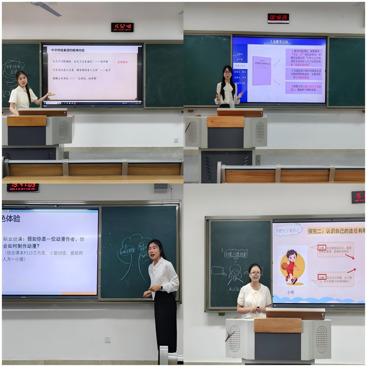 比赛过程中,各参赛选手根据教学设计方案,围绕所选教学主题进行限时3分钟的说课和10分钟的模拟课堂教学展示。选手们在教学演示中教态自然大方,教学行为规范严谨。他们准确把握中学政治课程标准要求,科学设计教学目标,教学环节层层递进、脉络清晰,板书设计巧妙呈现知识体系,展示了公司师范生扎实的专业功底。