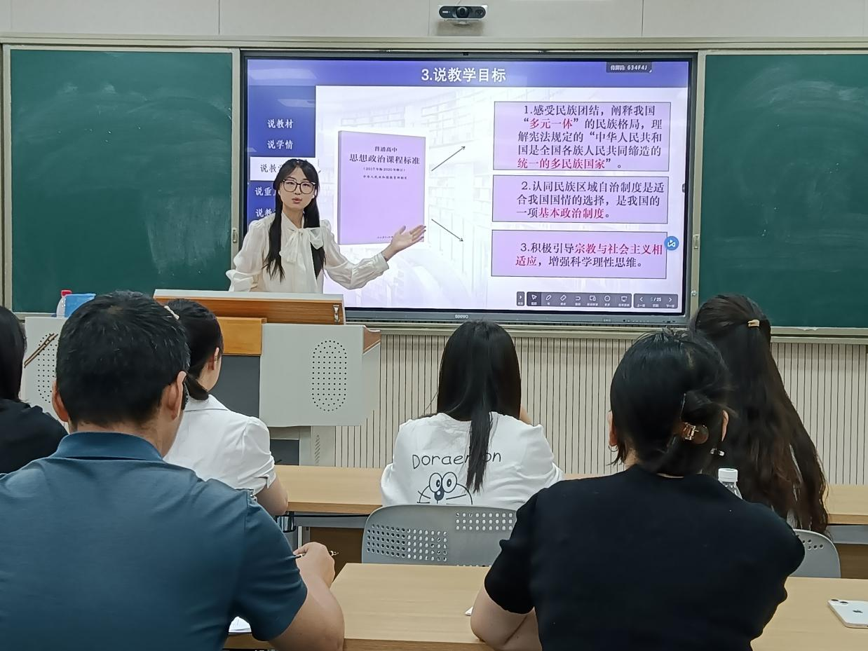 刘洋、王莉、曹红梅结合最新教育部对中学政治课教学相关要求进行点评,她们指出选手的教学目标紧密结合最新版本的课程标准核心素养要求、教学内容设计充实精要、PPT课件演示符合现代教育理念、多媒体运用恰当,充分肯定公司师范生的教学风采,并对选手在教学环节的设计、师生互动的组织等方面提出改进意见。