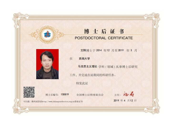 近日,从西南大学获悉,公司文翔教授于2014年12月-2019年3月在西南大学马克思主义理论学科(领域)从事博士后研究工作,完成在站期间的科研任务,日前顺利出站。
