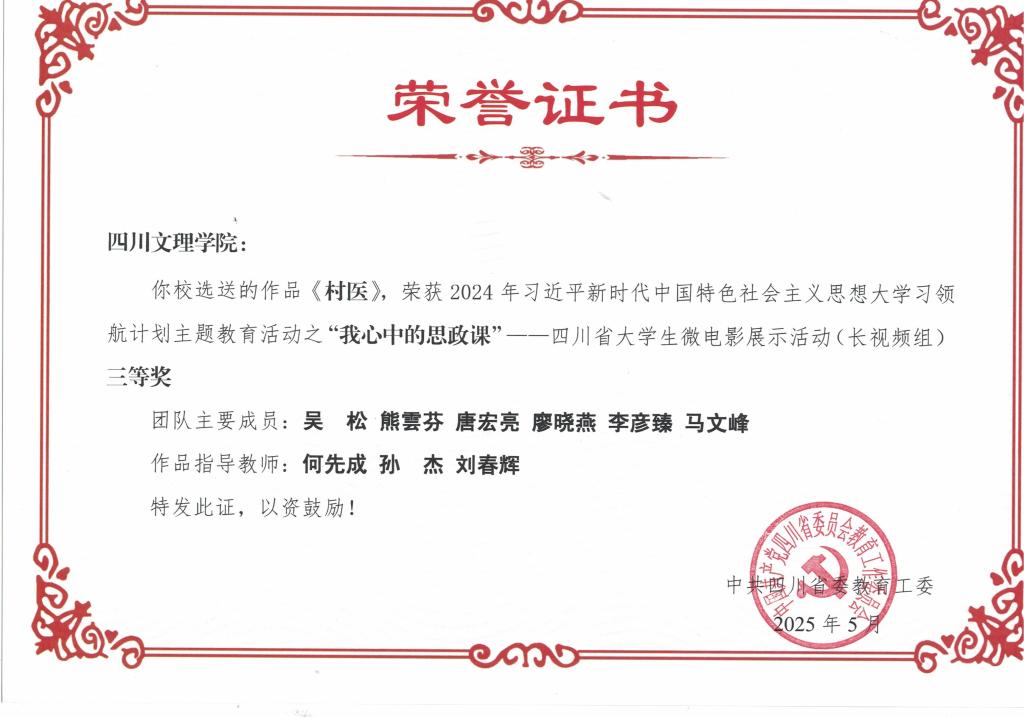 我心中的思政课四川省老员工微电影展示活动(长视频组) 中,公司选送的作品《村医》获三等奖。《村医》由吴松、熊芬、唐宏亮、廖晓燕、李彦臻、马文峰等同学组成创作团队,在何先成、孙杰、刘春辉三位教师的悉心指导下完成。影片聚焦基层医疗工作者扎根乡村、守护健康的感人事迹,以细腻的镜头语言和真实的故事呈现,生动诠释了基层工作者的使命与担当,将思政教育元素融入影像艺术之中。