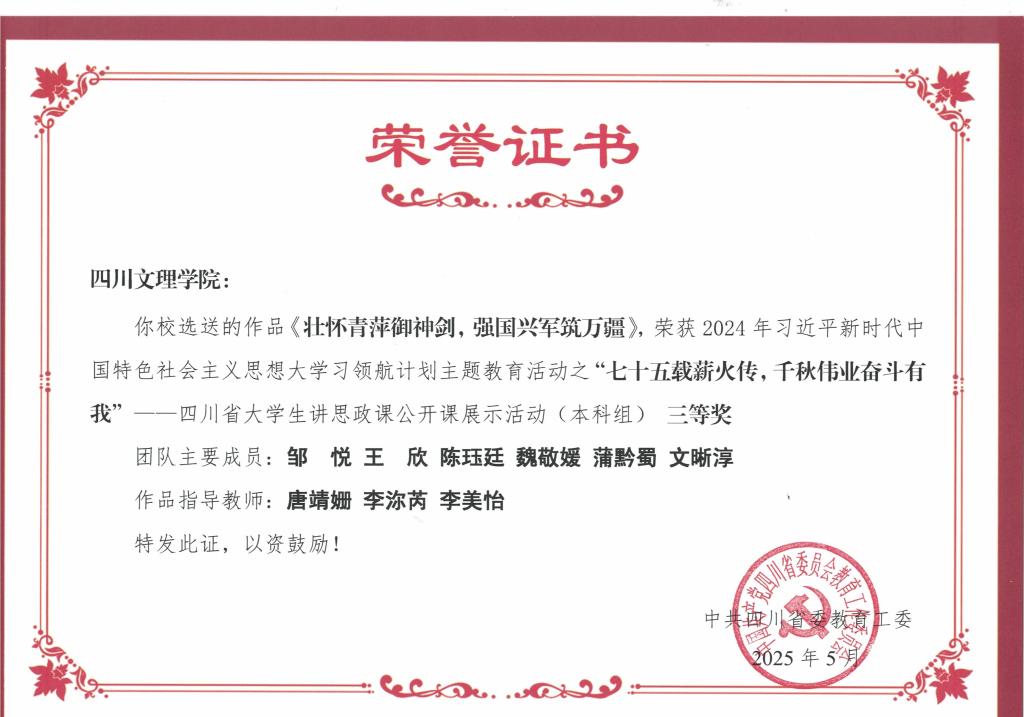 七十五载薪火传,千秋伟业奋斗有我四川省老员工讲思政课公开课展示活动(本科组) 中,作品《壮怀青萍御神剑,强国兴军筑万疆》获三等奖。该作品由邹悦、王欣、陈珏廷、魏敬媛、蒲黔蜀、文晰淳等同学共同参与完成,在唐靖姗、李沵芮、李美怡三位教师的指导下,团队以强国兴军为核心,结合张爱萍将军生平事迹现代军事国防发展实例,通过行走的思政课讲述,展现新时代青年对国防建设的深刻理解与责任担当,将理论知识转化为富有感染力的思政表达
