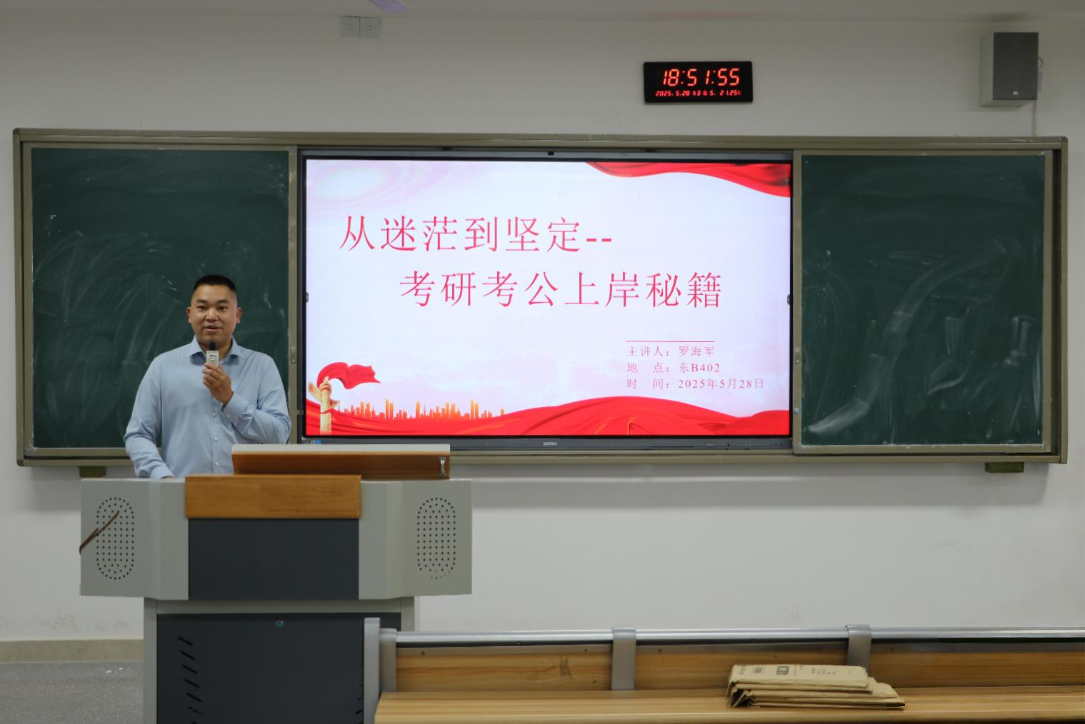 讲座伊始,罗老师系统阐释了考研、公务员考试的核心差异与选择逻辑,引导学生结合个人专业背景、职业兴趣与发展目标进行理性决策。针对考研群体,他重点剖析了政治、英语及专业课的复习攻略,强调分阶段目标设定与知识体系构建的重要性,并详细梳理了从预报名、正式报名到现场确认的关键流程节点。对于有意向进入公职体系的考生,罗老师则深入解读了岗位报考策略、考试内容侧重及长期备考规划,提醒考生需精准把握职位要求与竞争态势。